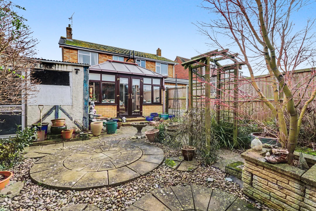 A low maintenance west facing rear garden mainly laid to paving with shrub and flower boarders, there is a large garden/storage room believed to be the original garage.