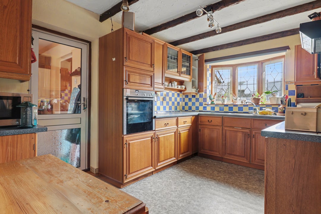 The kitchen comprises a range of eye and low level units with roll edge work surfaces incorporating sink and drainer unit, four ring gas hob, oven, space and plumbing for dishwasher, washing machine and free standing fridge/freezer. Tiled splash backs, window to front aspect and door leading to lobby.