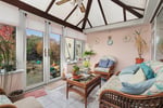 A part brick built structure with a Upvc roof, ceiling fan, windows and French doors opening to west facing rear garden.