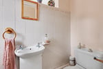 A two piece suite comprising low level WC, hand wash basin, part tiled walls, obscure window to rear aspect.