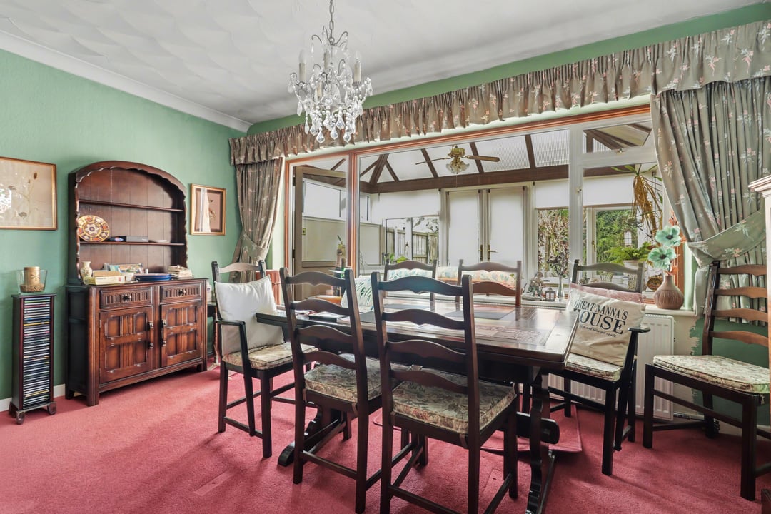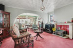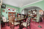 A spacious west facing room with a feature fireplace, stained glass windows to side aspect, coving to textured ceiling, this room is open plan to the :