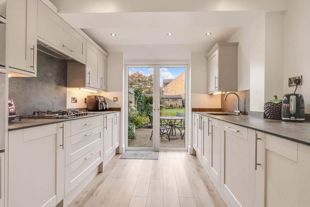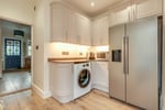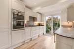 Comprises a matching range of eye and base level storage units complemented by the square edge work surfaces. Matching upstands. Space and pluming for washing machine. Space for an American style fridge freezer. Solid wood flooring.