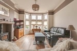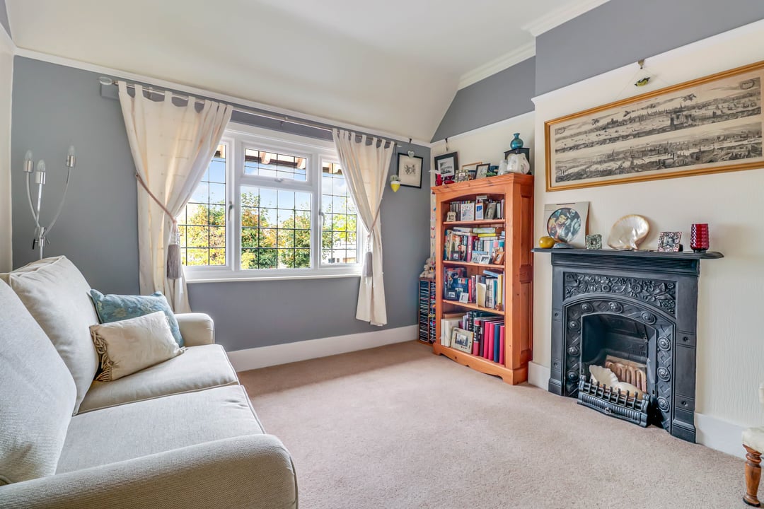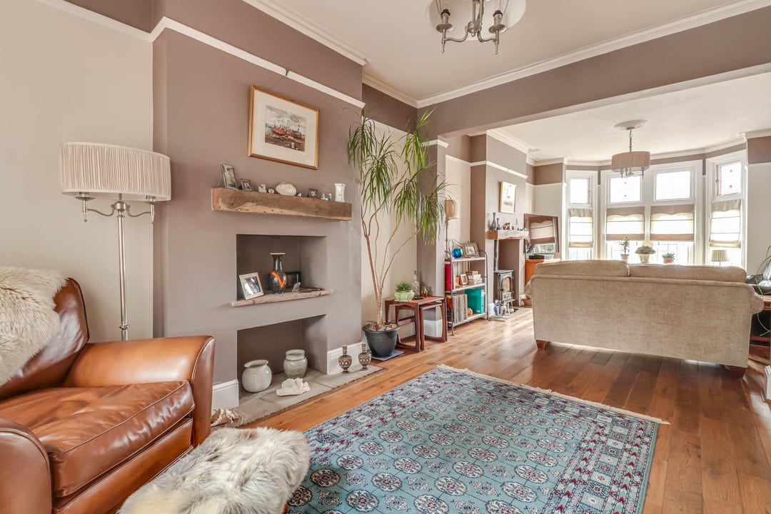 A double length room; lounge area with a double glazed bay window to front aspect. Fireplace with inset log burner. Solid wood flooring running from front to back. The lounge is open to a second reception area. Sliding doors link with the open plan kitchen / dining area.