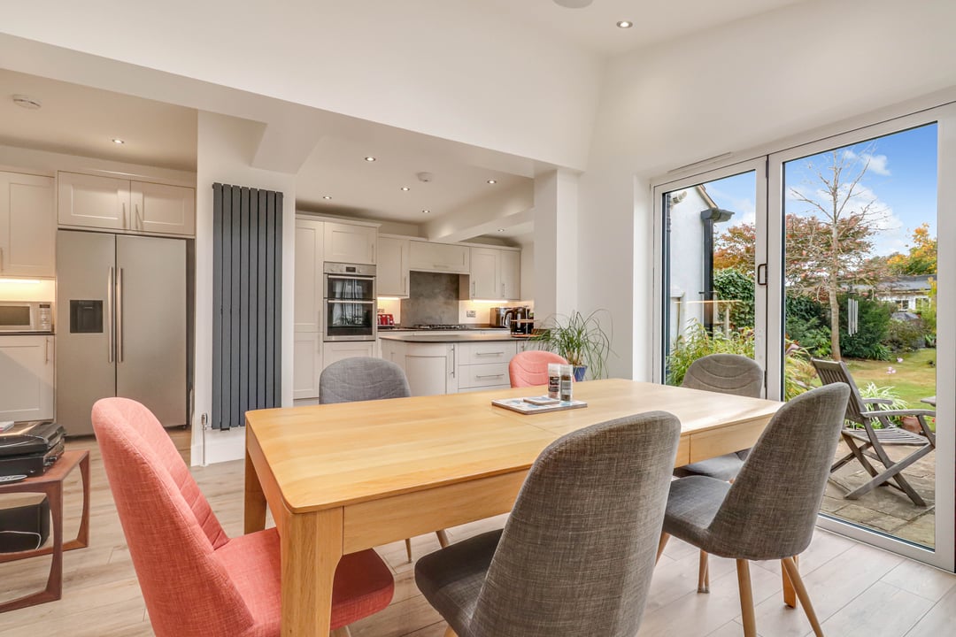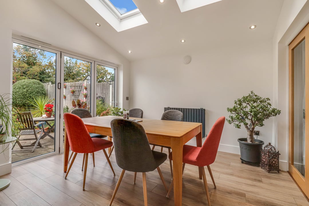 A bright room boasting ample space for a large dining room table set out beneath the vaulted ceiling with Velux windows. Double glazed bi-fold doors opening onto the patio; perfect for entertaining. Solid wood flooring. This space is open to :