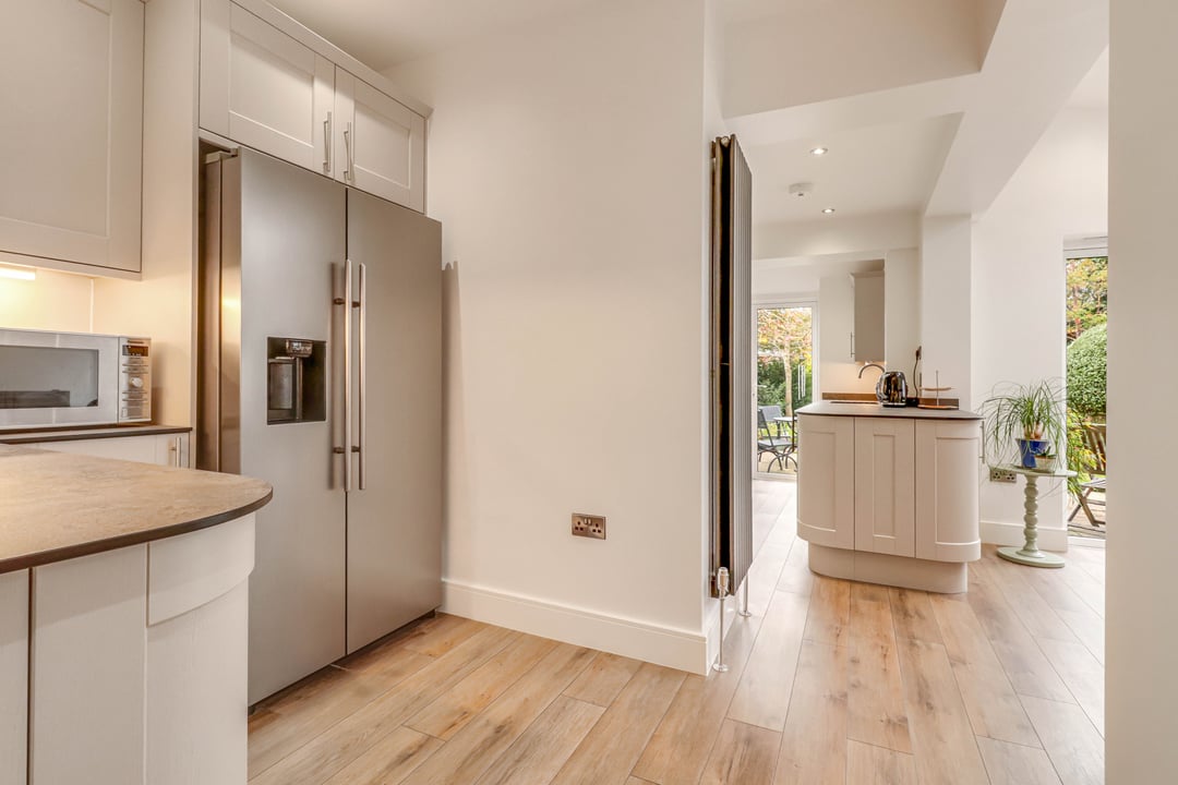 The kitchen comprises an extensive range of full height, eye and base level storage units complemented by the square edge work surfaces with undermount sink and inset mixer tap. Matching upstands. Under unit courtesy lighting. Built-in oven and grill. Inset 5 ring gas hob under extractor. Integrated dishwasher. Double glazed French doors opening onto the garden. Solid wood flooring. The kitchen is open to :