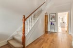 A spacious reception hall with solid wood flooring. Traditional staircase rising to the first floor accommodation. Doors lead to :