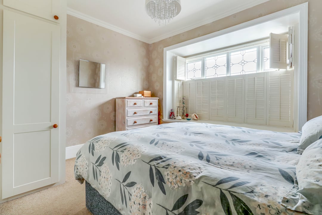 Master bedroom with fitted wardrobes. Large double glazed bay window with window seat and fitted shutter blinds.