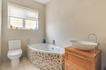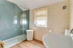 A three piece suite comprising double length walk in shower with glass screen, low level dual flush WC and wash hand basin. Tiled walls and ceramic splash backs. Extractor fan. Obscure double glazed window to rear aspect.