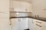Comprises a range of eye and base level storage units complemented by the rolled edge work surfaces with inset sink and mixer tap. Integrated fridge-freezer.