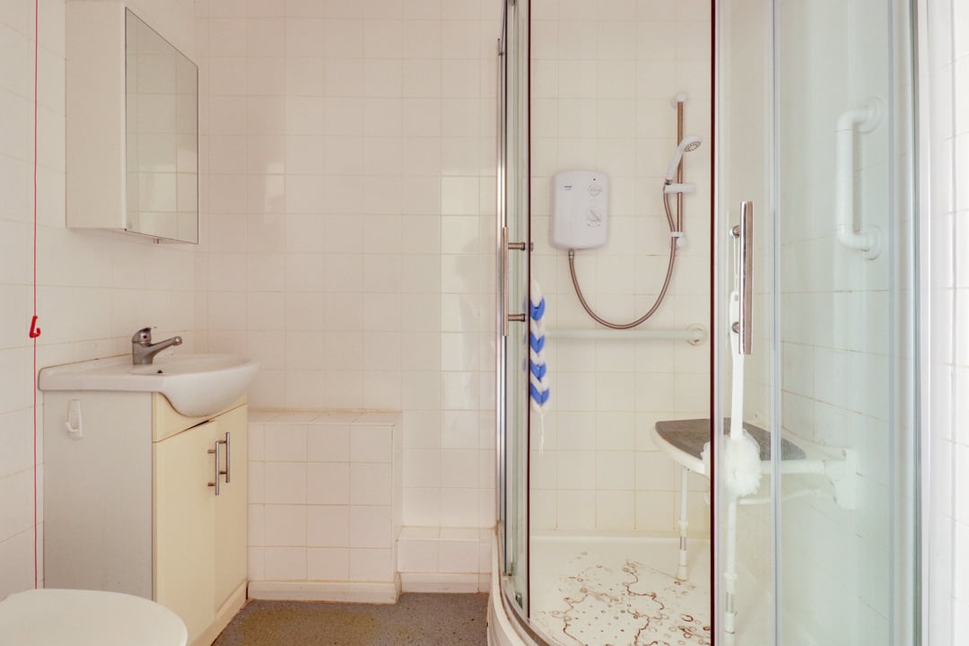 A part tiled room comprising large shower enclosure, low level W.C. and wash hand basin with storage beneath. Extractor fan.