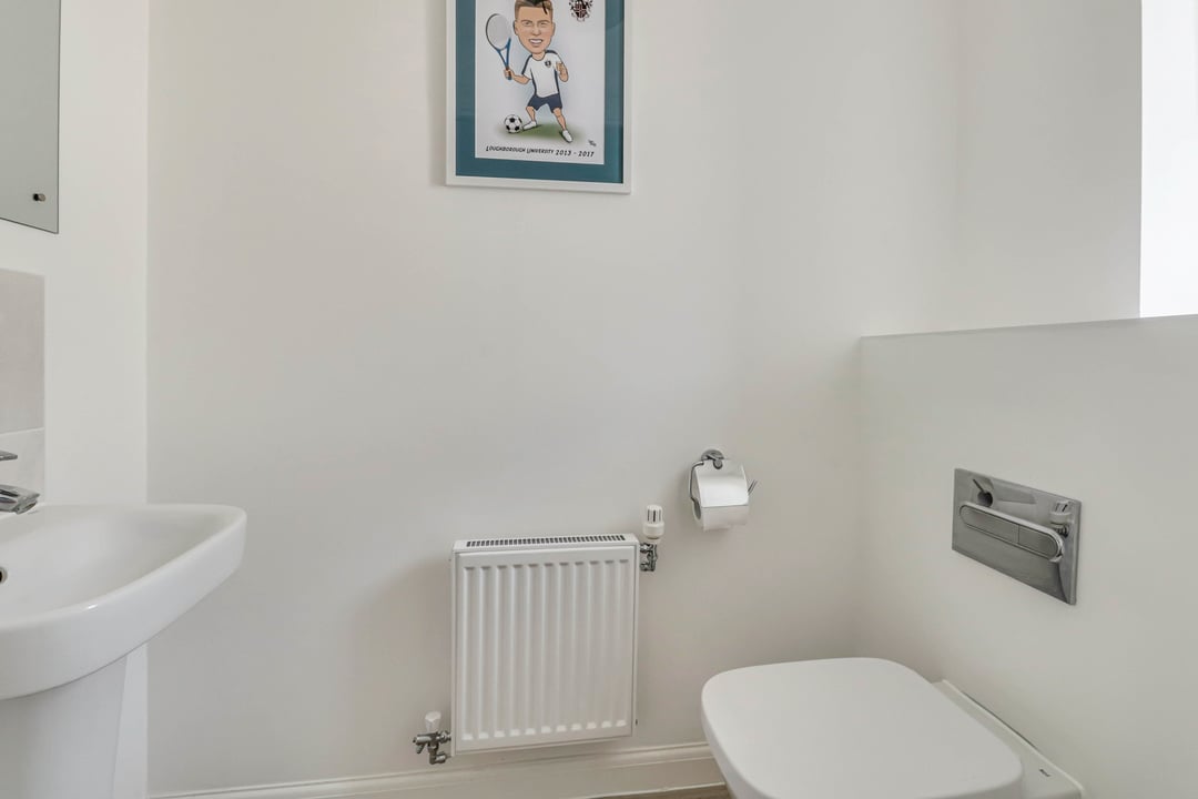 Comprises low level W.C. with concealed cistern and wash hand basin with tiled splashback. Amtico flooring. Double glazed window to front aspect.