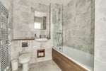 A fully tiled room comprising bath with shower above and glass screen, low level W.C. with concealed cistern and a designer wall mounted wash hand basin set in vanity ledge. Chrome towel radiator. Two extractor fans.