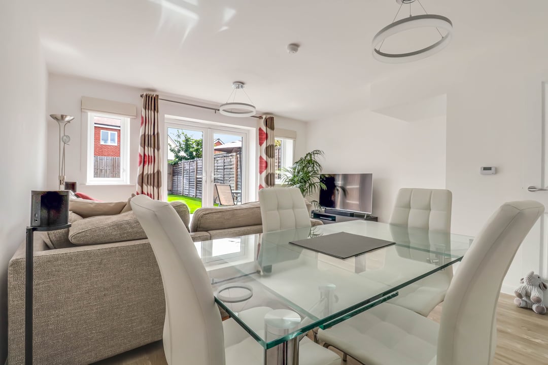 A large reception room with space for a family dining table and separate seated reception area ahead of double glazed French doors that open directly onto the landscaped garden; perfect for entertaining. Double glazed windows to rear aspect. Large under stairs storage cupboard. Amtico flooring. Dimmer lighting system with designer light fittings.