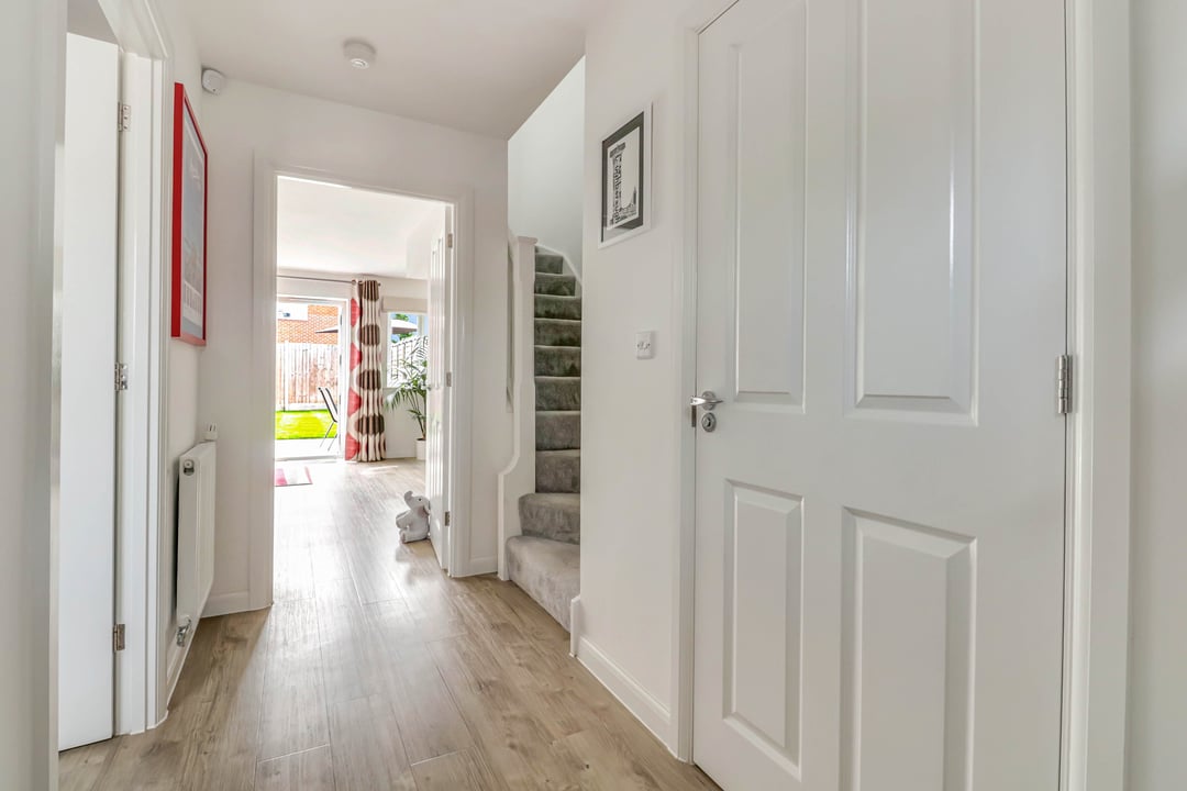 Reception hall with stairs rising to the first floor accommodation. Amtico flooring. Doors lead to :