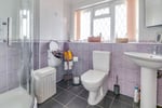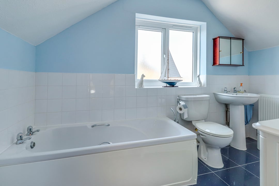 A part tiled room comprising of bath, low level W.C. and pedestal wash hand basin. Eaves storage cupboard. Obscured double glazed window to side aspect.
