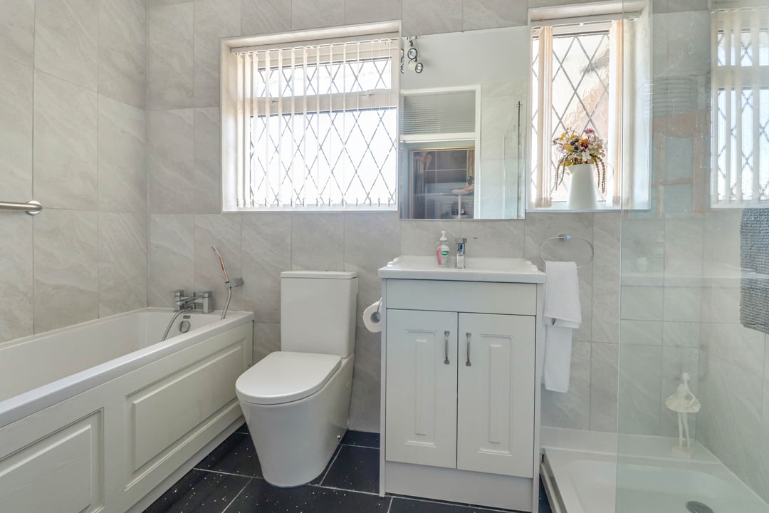A fully tiled room comprising of bath, double width walk-in shower with glass screen, low level W.C. and vanity wash hand basin with storage beneath. Chrome towel radiator. Two obscured double glazed windows to front aspect.