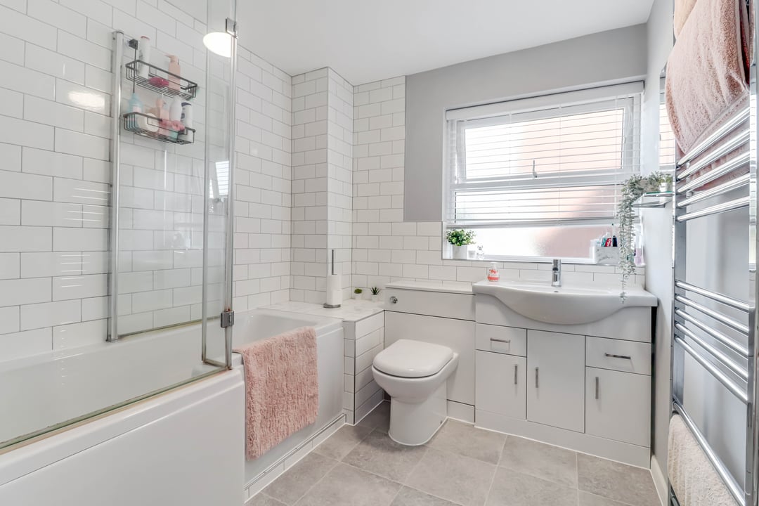 A fully tiled room comprising bath with shower above and screen, low level W.C. with concealed cistern and a wash hand basin set in large storage unit. Chrome towel radiator. Obscure double glazed window to side aspect.