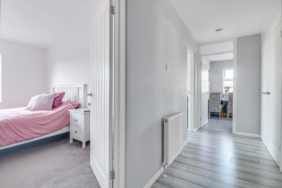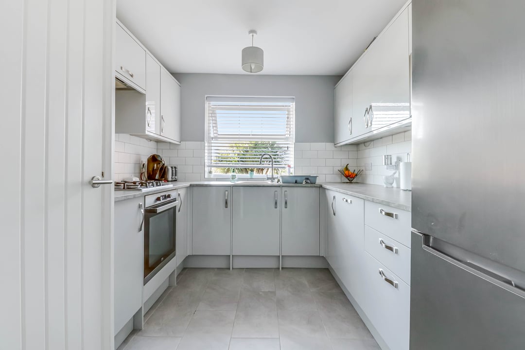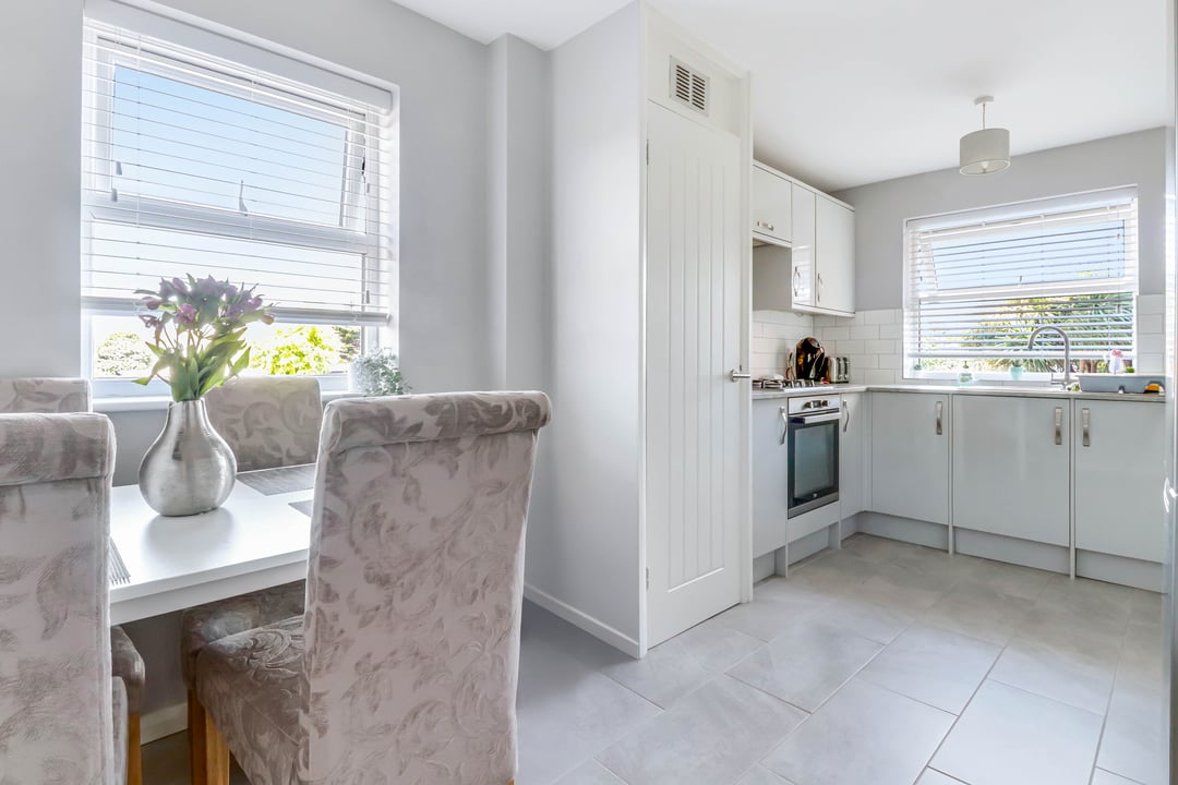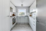 The kitchen comprises a range of full height, eye and base level storage units complemented by the rolled edge work surfaces with inset sink and mixer tap. Tiled splashbacks. Inset hob under extractor. Built-in oven. Integrated Dishwasher and microwave. Space for freestanding fridge-freezer. Space for a breakfast table. Tiled floor. Double glazed windows to rear and side aspects.