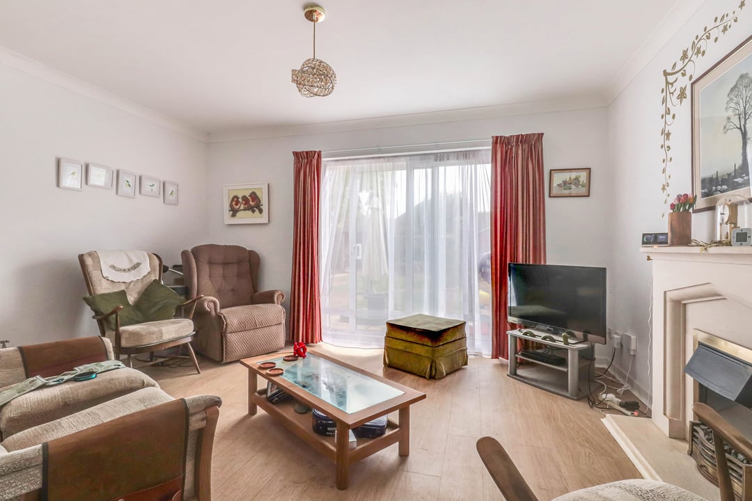 uPVC double glazed sliding doors open directly onto the rear garden. Feature fireplace surround inset with electric fire. Laminate wood effect flooring. Contemporary column radiator. Sliding doors open to :