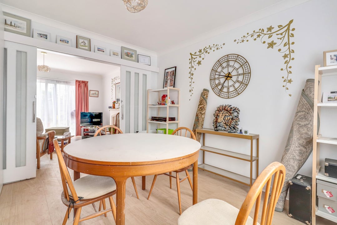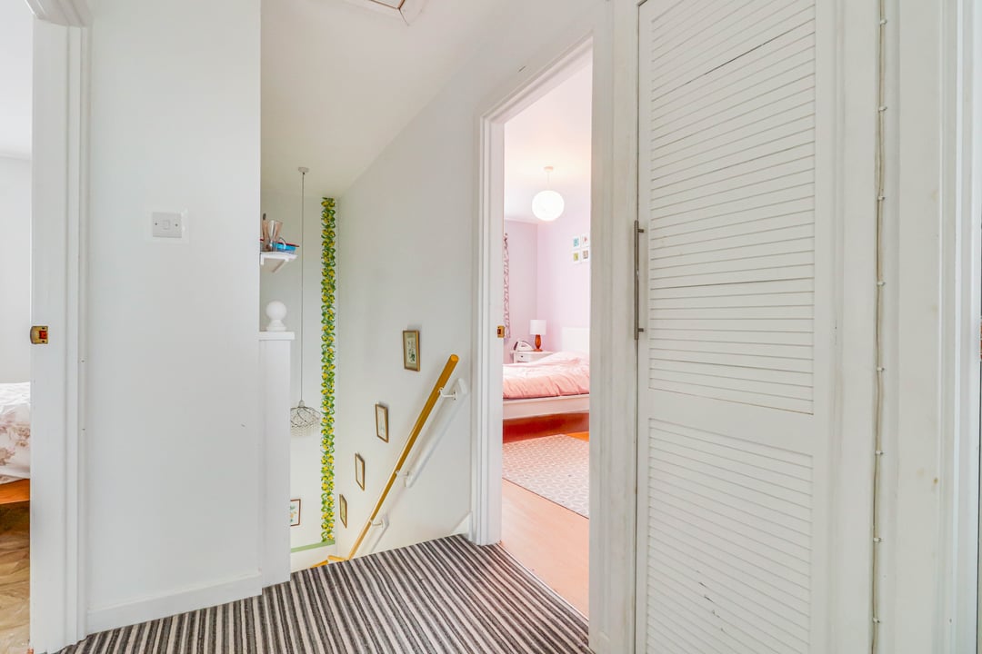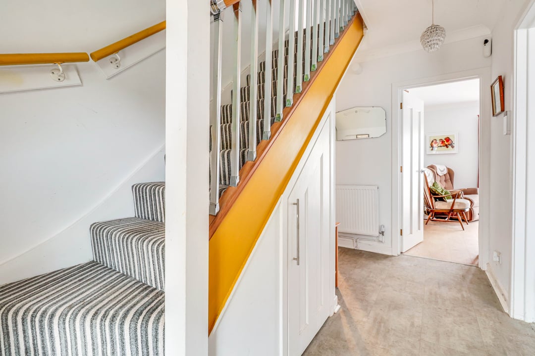 Turned staircase with contemporary stainless steel balustrade and wooden handrail. Half-height under-stair storage cupboard. Radiator. Panelled doors to Living Room, Dining Room and Ground Floor Shower Room. Coving to ceiling. Part glazed door leads to :