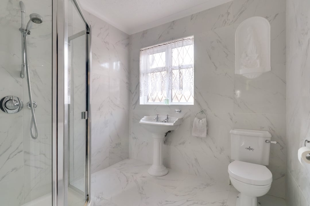 A fully tiled room comprising large shower enclosure with glass screens, low level W.C. and pedestal wash hand basin. Chrome towel radiator. Obscure double glazed window to side aspect.