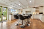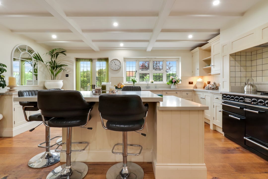 The bespoke kitchen comprises an extensive range of full height, eye and base level storage units complemented by the Granite work surfaces with undermount sink and inset mixer tap. Under unit courtesy lighting. Space for a Range cooker under extractor. Recessed space for American style fridge-freezer. Integrated bin and dishwasher. Large central island with breakfast bar extension and space for stools. Double glazed window and French doors to rear. Part glazed double doors to rear reception / diner.