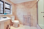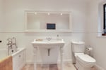 Comprises bath, low level W.C and large pedestal wash hand basin. Towel radiator. Obscured double glazed window to rear aspect.