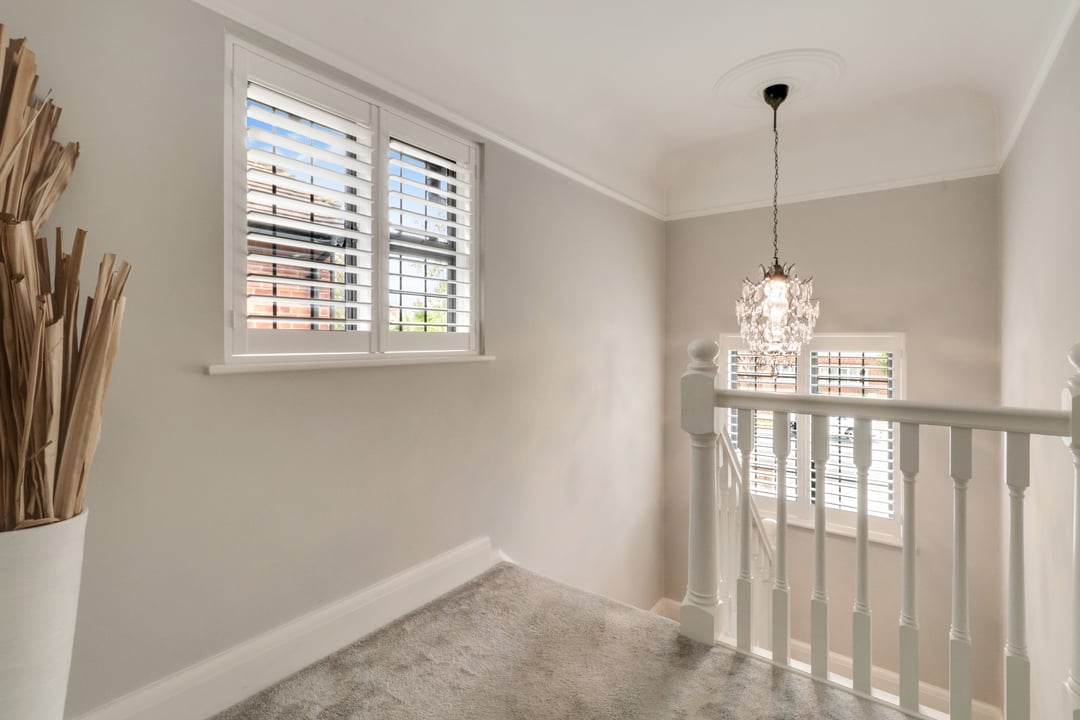 Double glazed windows with fitted shutters to the front and side aspects. Airing cupboard storage. Loft access hatch. Doors lead to :