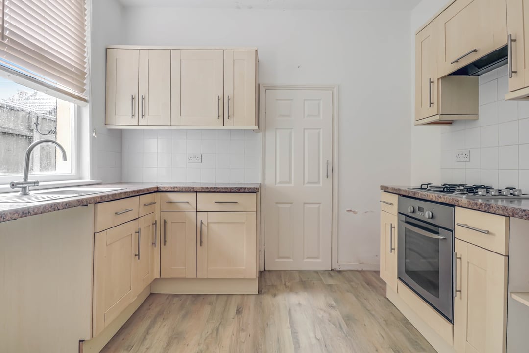 The kitchen comprises a range of eye and base level storage units complemented by the rolled edge work surfaces with inset sink and mixer tap. Tiled splashbacks. Inset hob under extractor. Built-in single oven. Space and plumbing for washing machine / dishwasher. Double glazed window and door to side aspect. Under stairs storage cupboard. Internal door links with :