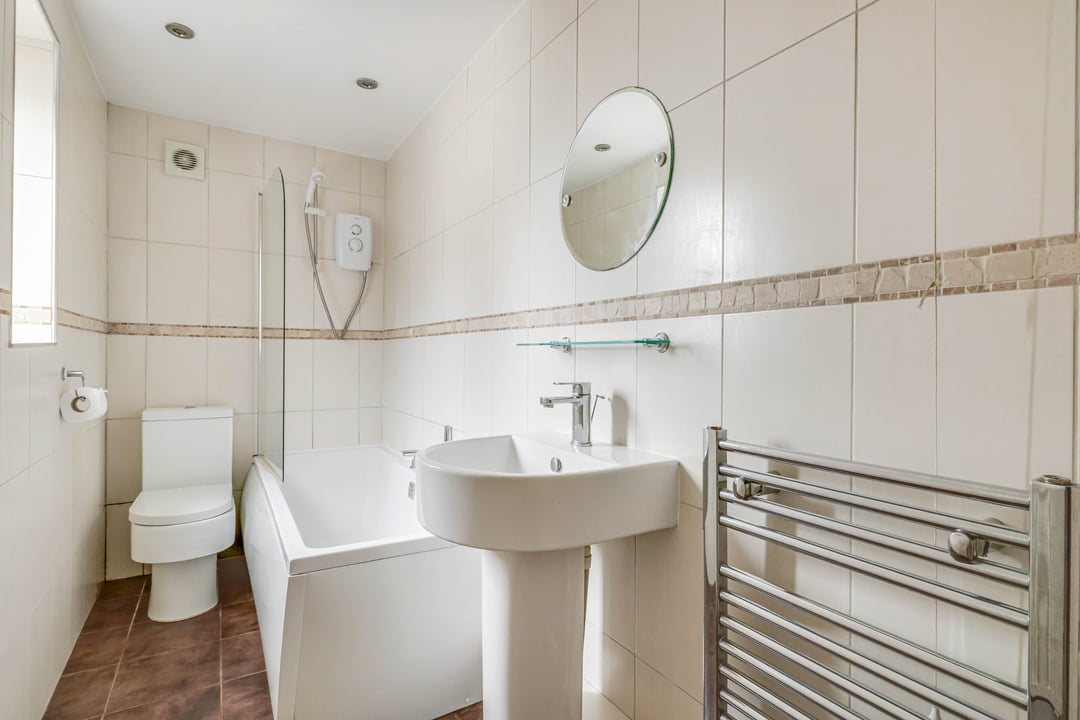 A part tiled room comprising bath with shower above and screen, low level W.C. and pedestal wash hand basin. Towel radiator. Extractor fan. Double glazed window to side aspect.