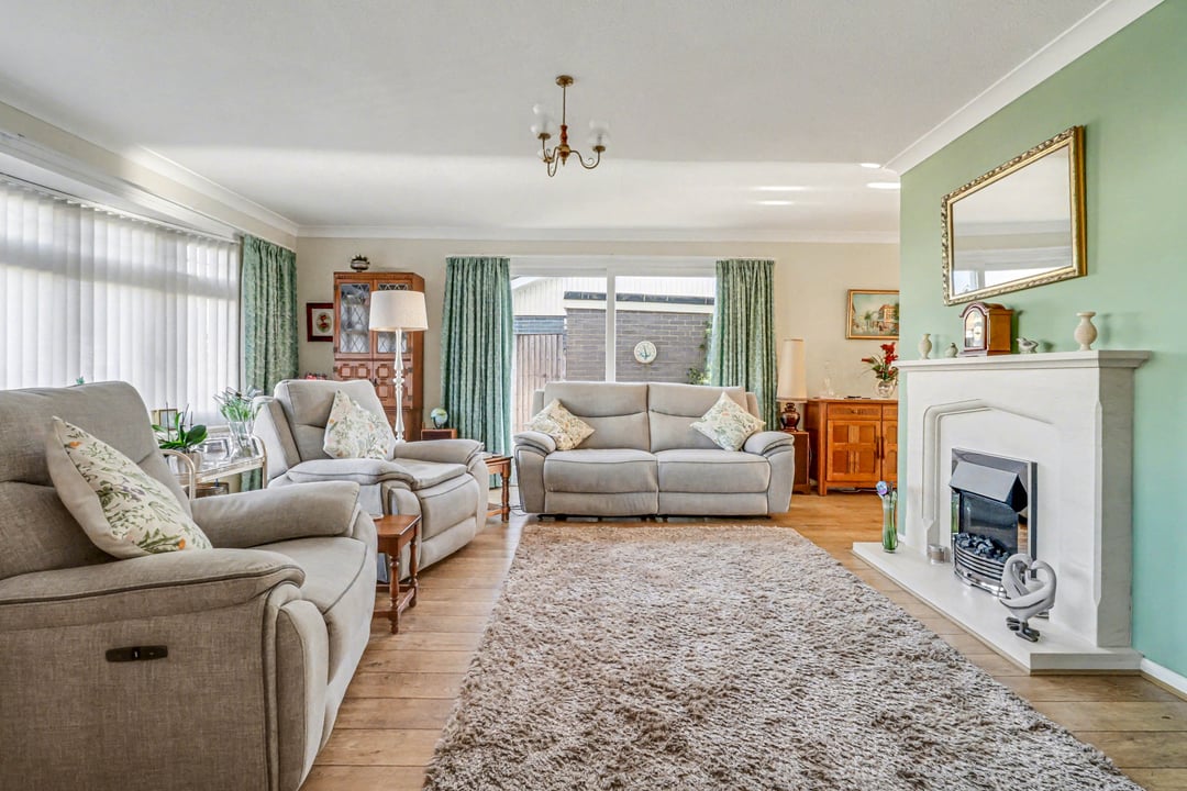 A dual aspect room with a double glazed bay window to the front and double glazed patio doors to the side. Feature fireplace with decorative surround, marble hearth and inset fire basket. This room is open to :