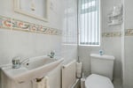 A fully tiled room comprising low level W.C. and wall mounted wash hand basin. Obscured double glazed window to rear aspect.