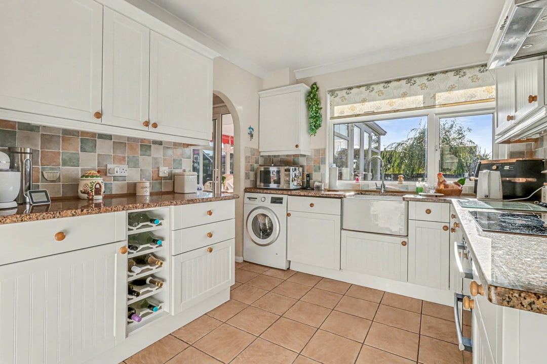 The kitchen comprises a range of eye and base level storage units complemented by the Granite work surfaces with undermount sink and inset mixer tap. Tiled splashbacks. Inset hob under extractor. Built-in oven. Space and plumbing for washing machine. Double glazed window to rear aspect. Tiled floor.