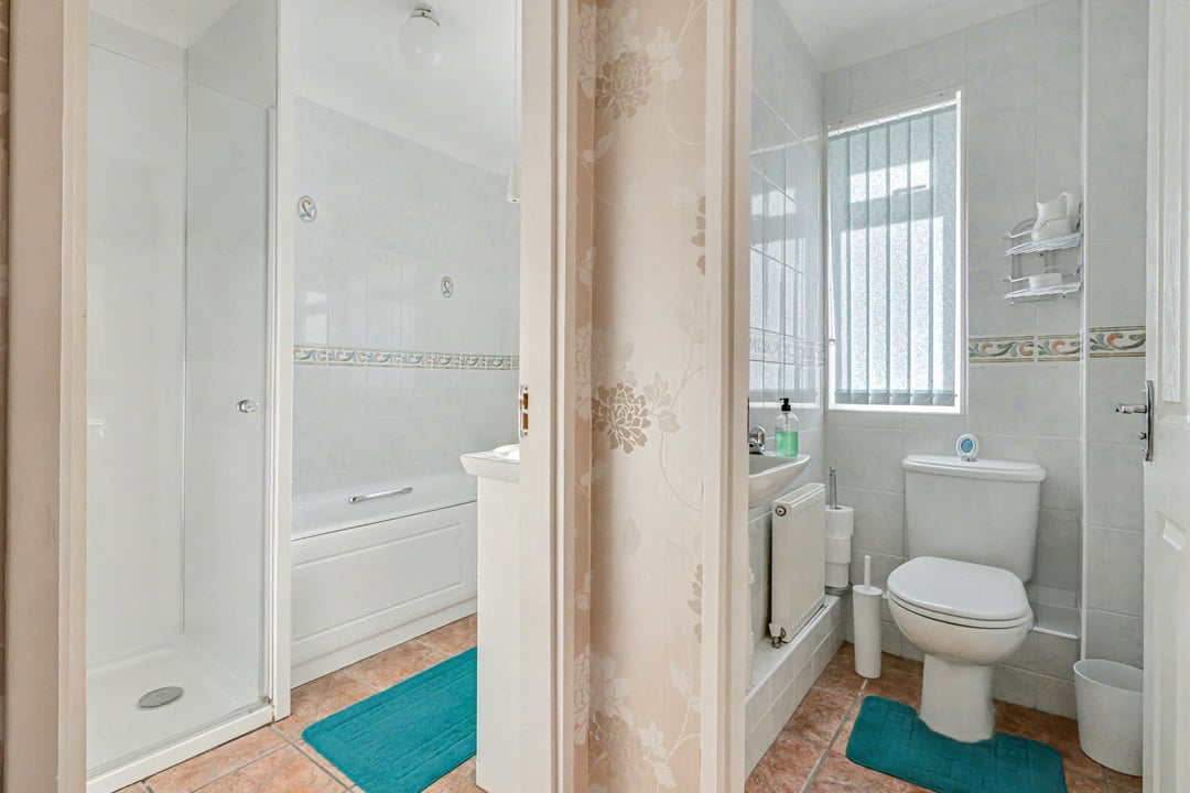 A fully tiled room comprising shower cubicle, bath, low level W.C. and wash hand basin with storage beneath. Obscured double glazed window to rear aspect.
